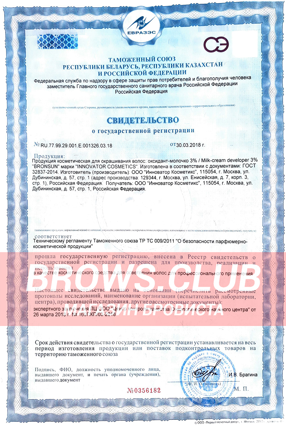 Свидетельство о государственной регистрации на оксид для краски для бровей и ресниц Bronsun