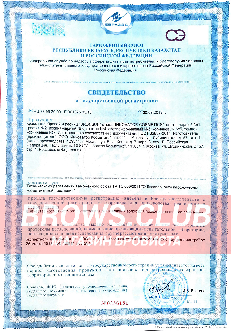 Свидетельство о государственной регистрации на краску для бровей и ресниц Bronsun