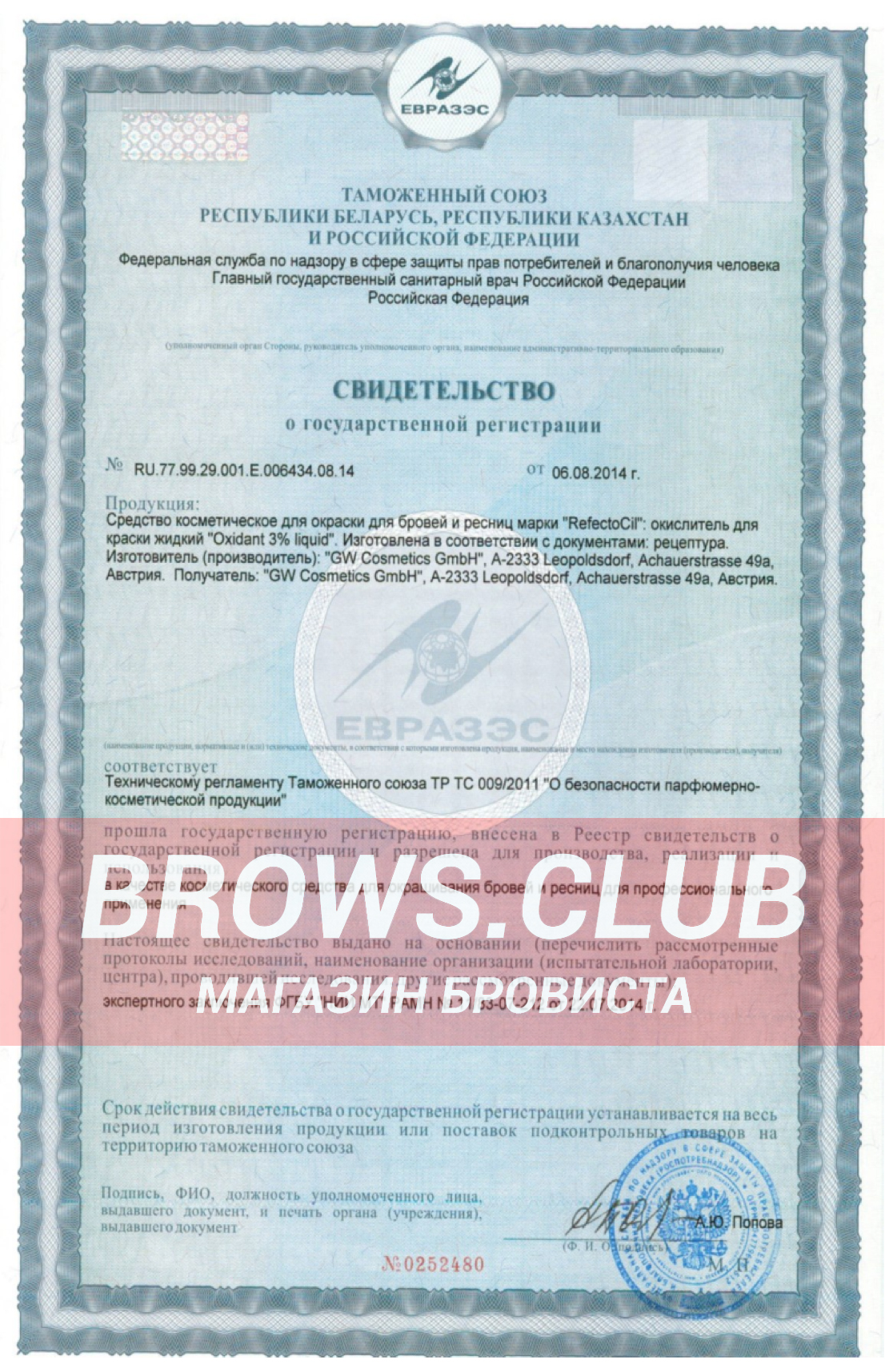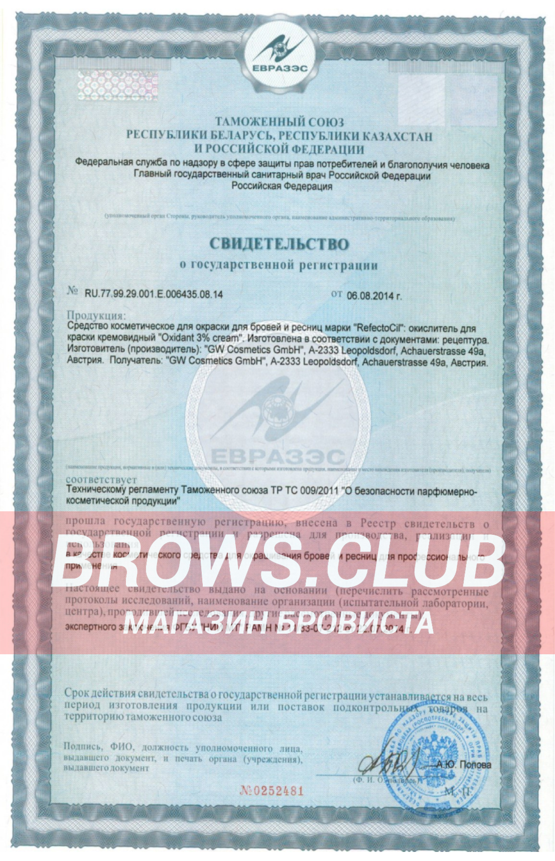 RefectoCil (краска для бровей и ресниц) - свидетельство о государственной на кремовый окислитель и жидкий окислитель
